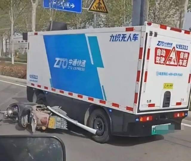 2025年4月8日,有网友拍到一辆倒地的电动车卡在无人快递车左前轮下,但车辆仍继续行驶;两个月后,2025年6月9日,又有网友拍到两辆印有韵达、申通及“九识无人车”字样的无人车在道路上“僵持”,伴随语音喊话“你让一下,谁让你在这里送货的,你有没有驾驶执照,退、退”,现场交通一度受阻。